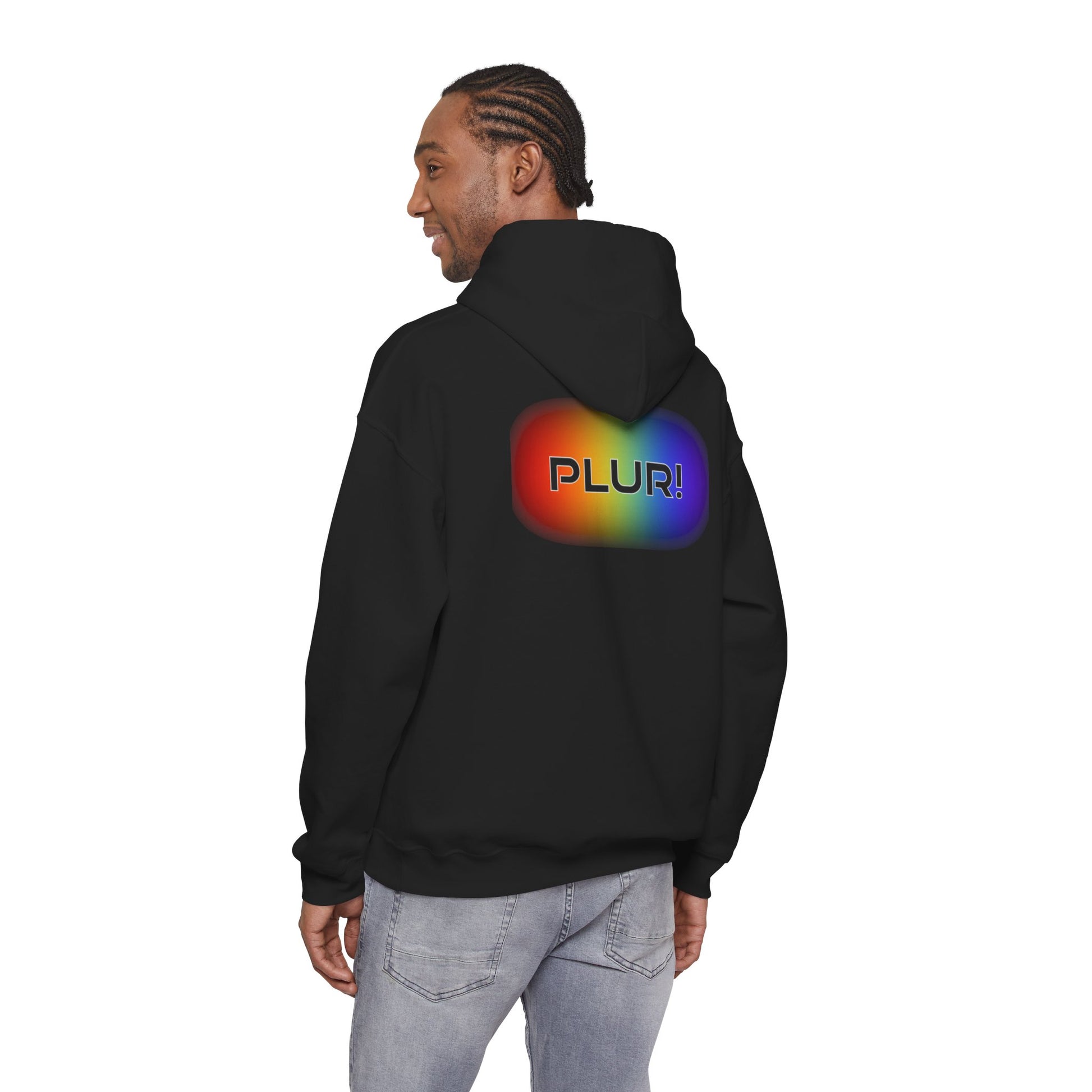 Wrap yourself in color and community with this cozy hoodie. The soft, medium-heavy cotton/poly blend feels warm without weighing you down. A bold, rainbow-backprint reads “PLUR!”—a bright, joyful call to peace, love, unity, and respect—set against the hoodie’s deep black canvas so the colors pop in low light. The roomy kangaroo pocket and adjustable drawstring hood make it an easy layer for late-night sets, post-show hangs, or slow mornings. Subtle construction details—double-lined hood, color-matched drawcord, and tubular knit with no side seams—keep the silhouette clean and durable. Choose embroidery placements on chest or wrists to add a tactile accent, or stick with the vivid DTF backprint for full-spectrum flair.