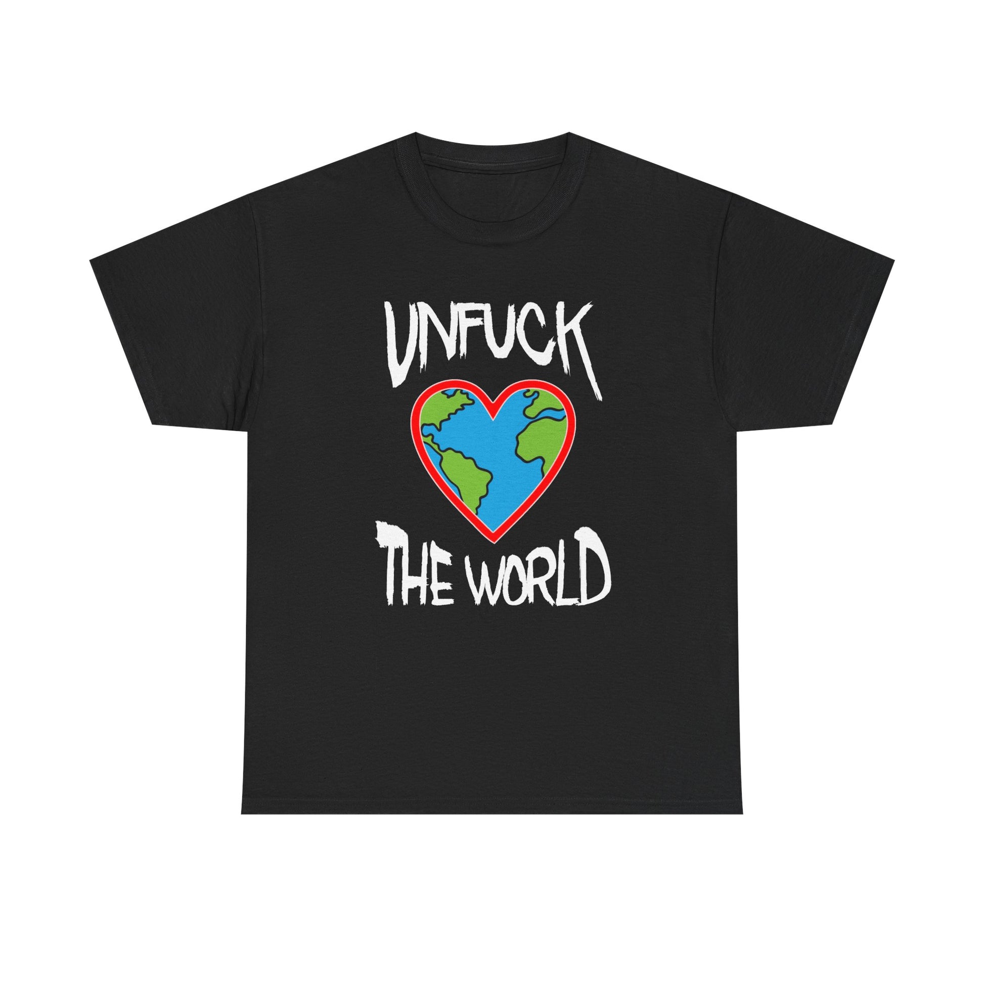 Wear your values with bold, honest energy. This relaxed-fit tee carries a hand-drawn heart-shaped globe and the blunt rallying cry “UNFUCK THE WORLD.” It feels like a conversation starter you slip on before a march, a volunteer day, or a late-night strategy session with friends. The soft, medium-weight cotton drapes comfortably while the vibrant print holds its edge through washes. This is for people who want their clothes to speak plainly — compassionate, fed-up, and ready to act. Let it sit with your favorite worn jeans, a flannel tied at the waist, or under a jacket when the weather turns. The design reads in a crowd and settles into quiet moments alike, a small declaration that care and urgency can live on the same shirt.
